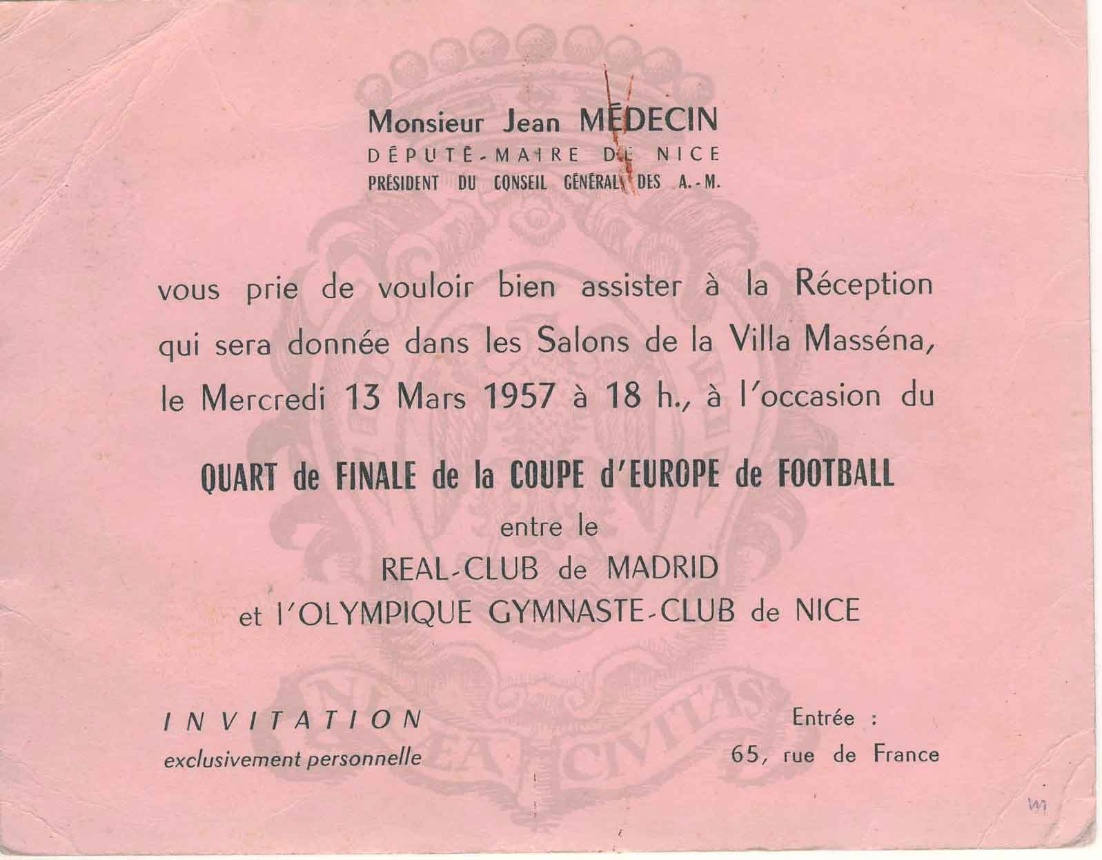 Le 4 février 1960, les niçois retrouvent sur leur chemin en 1/4 de finale de la Coupe d'Europe, le Réal de Madrid. Ce dernier avait battu le gym par deux fois en 1957 (3-0 à Madrid et 3-2 à Nice). Mais l'année 1960 fut un tournant pour l'OGCNice, qui menait par 2 à 0 à la mi temps, et renversait la tendance en seconde période grâce Nuremberg.