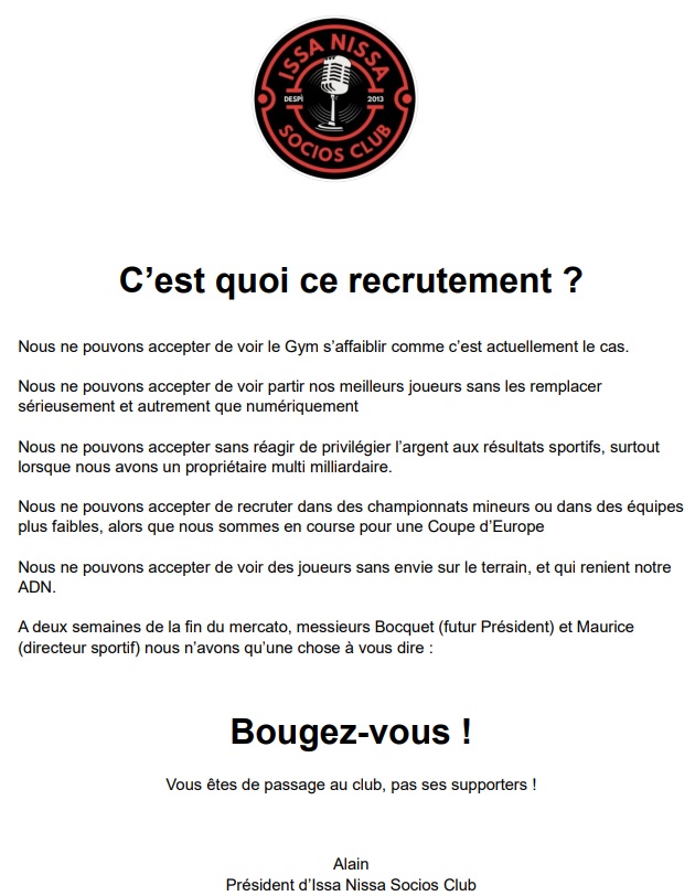 L'association de supporters "Issa Nissa Socios Club " communique sur la situation de l'OGCNice et son recrutement