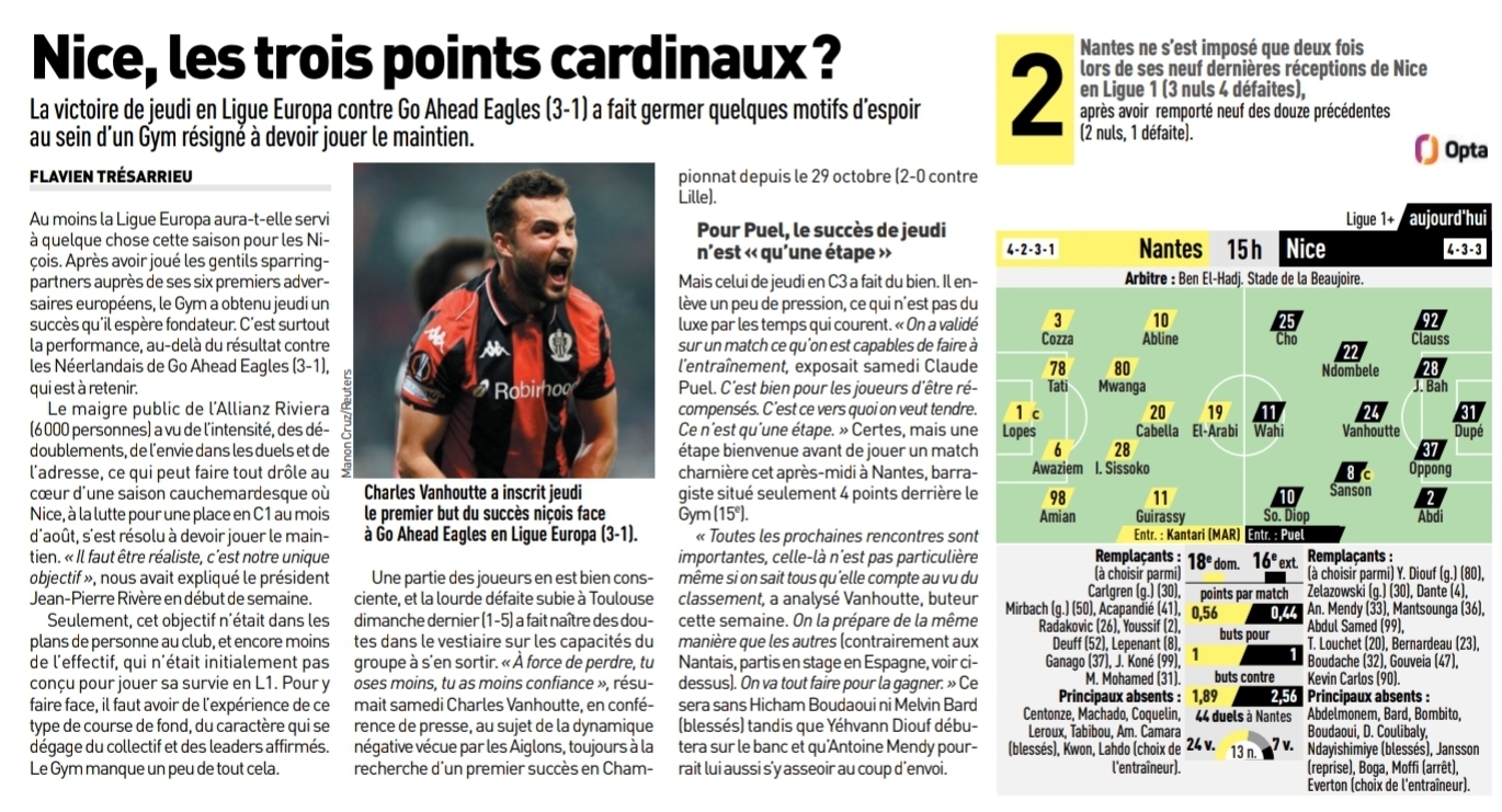 Le FC Nantes joue très gros ce dimanche 25 janvier, à 15 h, à la Beaujoire. Les Canaris, 16es et barragistes, accueillent l’OGC Nice, premier non relégable (15e) qui a 4 points d’avance sur les Nantais.