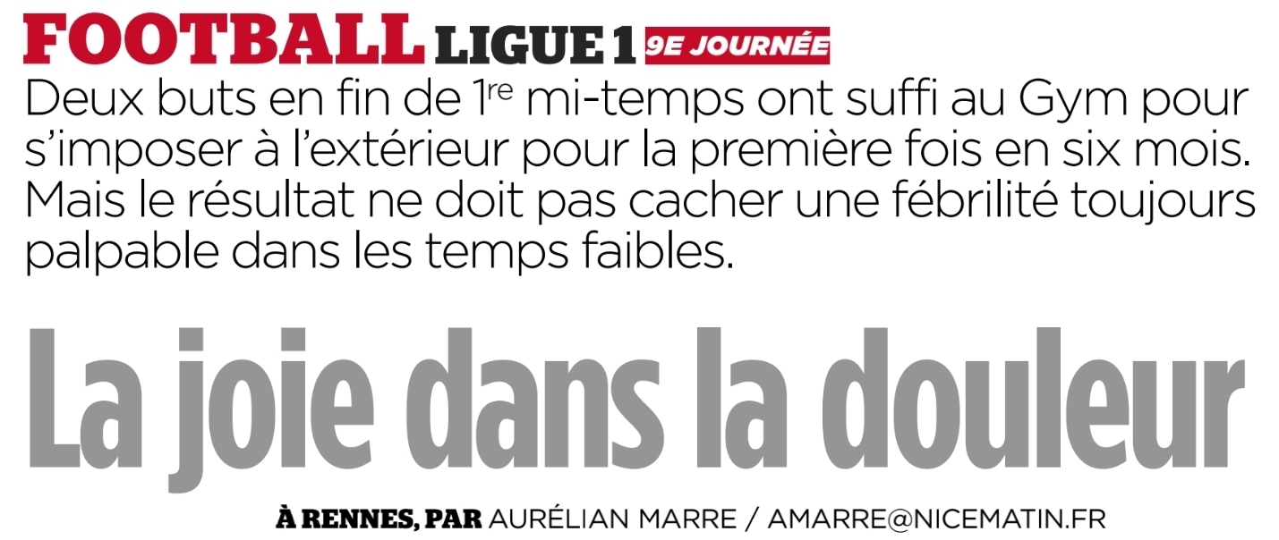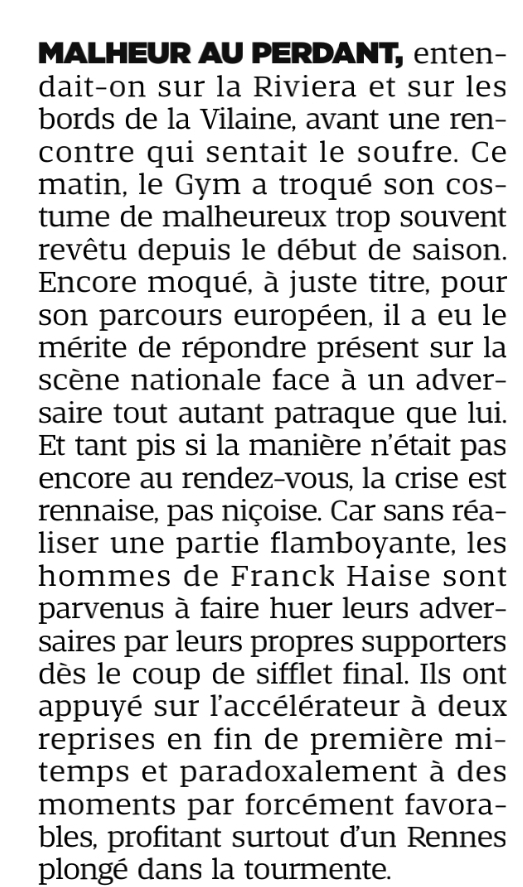 Les niçois ont fait une première mi-temps excellente mais se sont effondrés en seconde période. Au courage et grâce à Diouf, le Gym revient avec trois points de ce déplacement. On notera aussi l'excellente partie de Mendy mais aussi la transparence de Carlos.