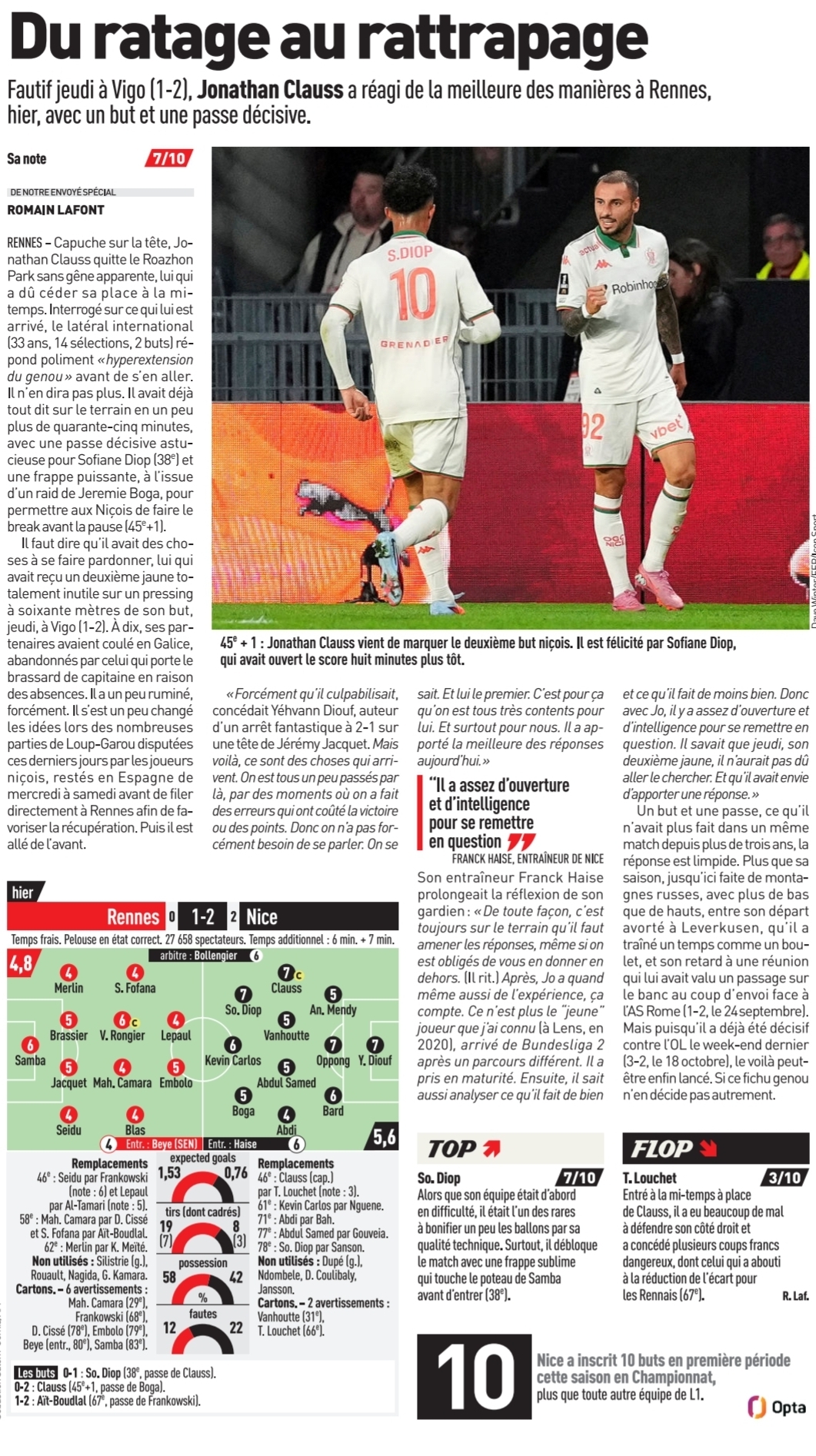Nice : Diop (38e), Clauss (45e +1)