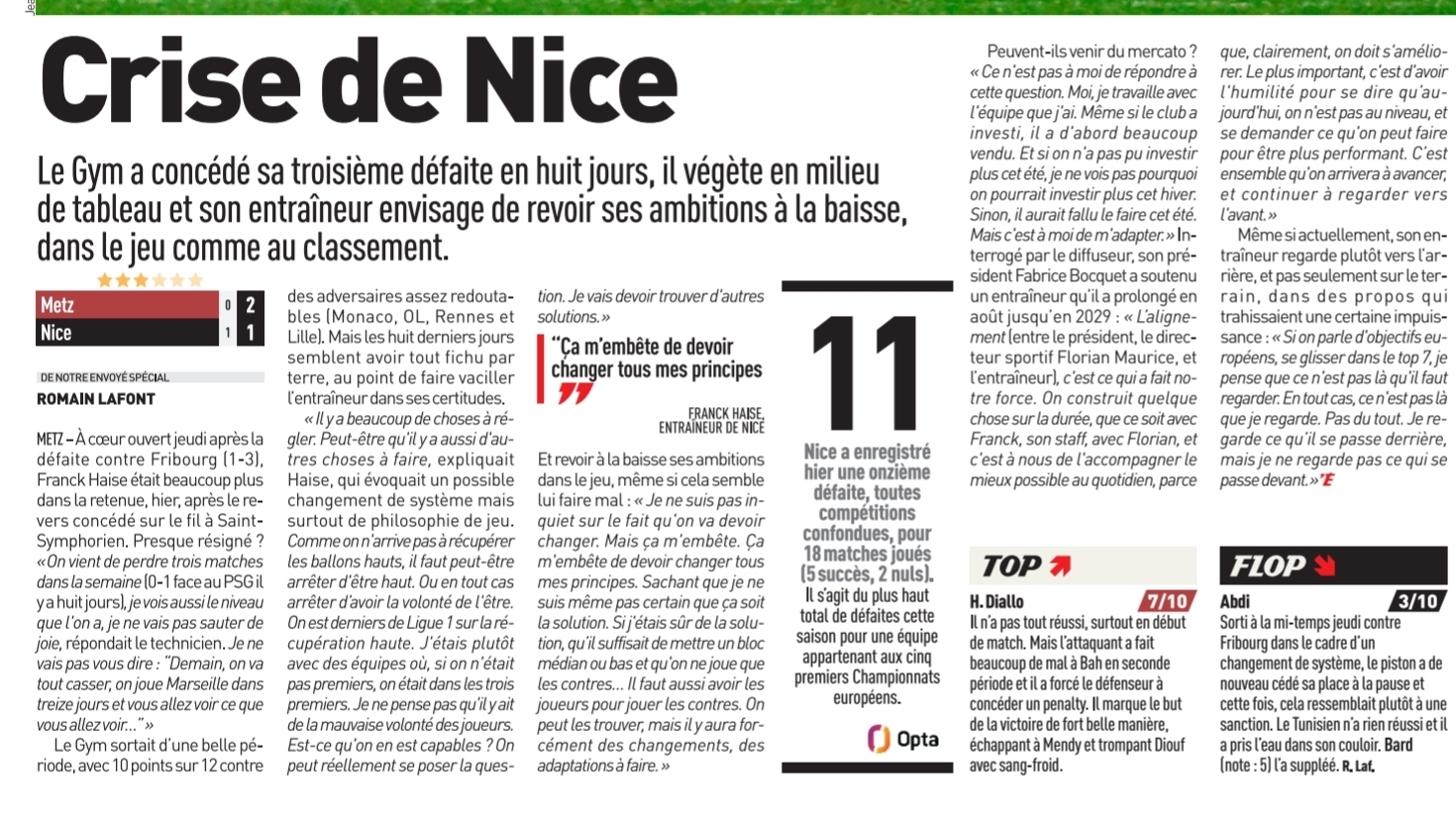 Un coup de gueule et... ça ne repart pas. Particulièrement énervé après l'énième défaite de son équipe face à Fribourg en milieu de semaine sur la scène européenne (1-2), Franck Haise avait ouvertement tancé ses joueurs et attendait une réaction. Celle-ci n'est pas venue sur la pelouse de Saint-Symphorien. Les Aiglons ont concédé leur troisième revers de la semaine, toutes compétitions confondues - la deuxième en Ligue 1 après celle à Paris - et ont été déplumés par des Grenats qui réalisent l'inverse, avec une troisième victoire de rang.