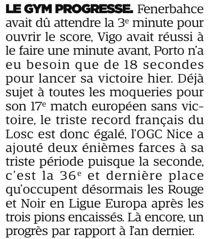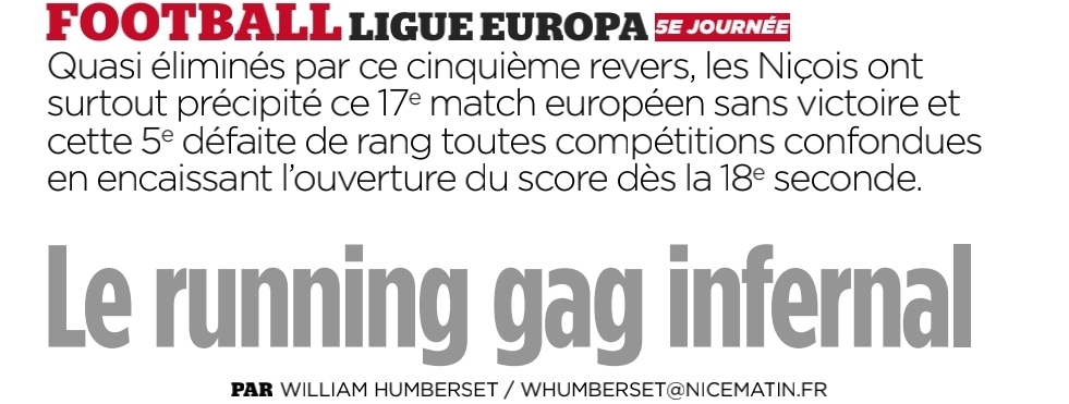 Le Gym entre dans l'histoire en égalant le record lillois de 17 matches sans victoire en Coupe d'Europe. L'OGC Nice est, aussi, le premier club Français à perdre ses 7 premiers matches d'une campagne européenne dans une même saison... Hormis cela comment expliquer que l'on ait fait signer un Carlos 5 ans vu les pieds carrés qu'il a? Comment certains aiglons comme Abdi ont une endurance à l'effort aussi faible? En conclusion il y a un gros problème dans ce club. Il faut sortir le directeur sportif, il faut s'adapter aux brèles qui composent cette équipe et faut surtout sauver ce qu'il peut être sauvé avec des joueurs concernés ce qui exclut Boga, Abdi, Sanson, Clauss... mais aussi les joueurs qui n'ont pas le niveau ce qui inclut Boga ( il est dans les 2 catégories) , Bah, Gouivia, Salis... Bref cela ne va pas être simple.