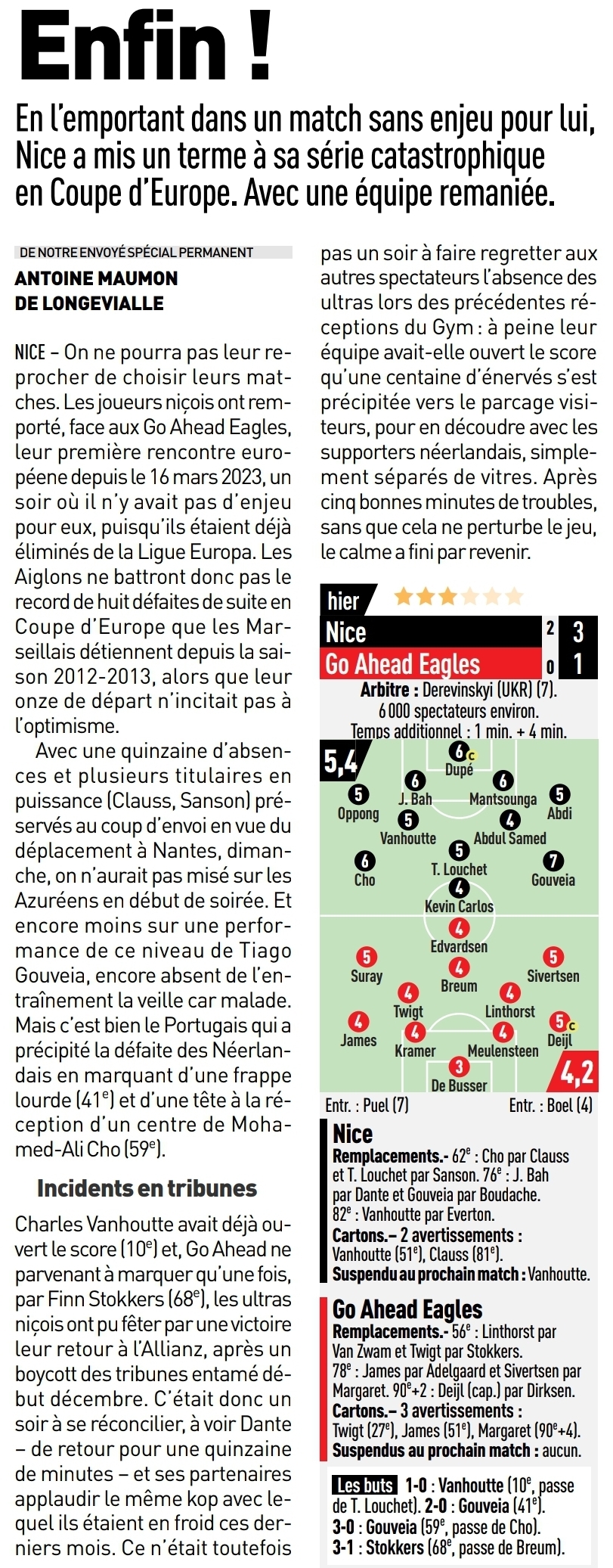 Kevin Carlos, qui ne met pas un pied devant l'autre depuis le début de saison, a réalisé lui un magnifique enchaînement contrôle poitrine-reprise du droit qui n'a pas été couronné de succès à la 50e, la transversale repoussant sa tentative alors que Jari De Busser, le portier néerlandais, n'avait pas esquissé le moindre geste. L'attaquant espagnol a placé également une tête puissante (78e) qui aurait pu mériter meilleur sort. Bon, Nice n'a pas terminé par une clean sheet (Stokkers buteur à la 68e), mais il ne faut pas trop en demander trop vite. Les Aiglons, qui quittent leur place de lanterne rouge (33es), ont ainsi mis un terme à une série terrible européenne de 17 matchs sans succès, un record pour un club de l'Hexagone, et stoppé 8 défaites d'affilée (triste record partagé avec l'OM). Orange