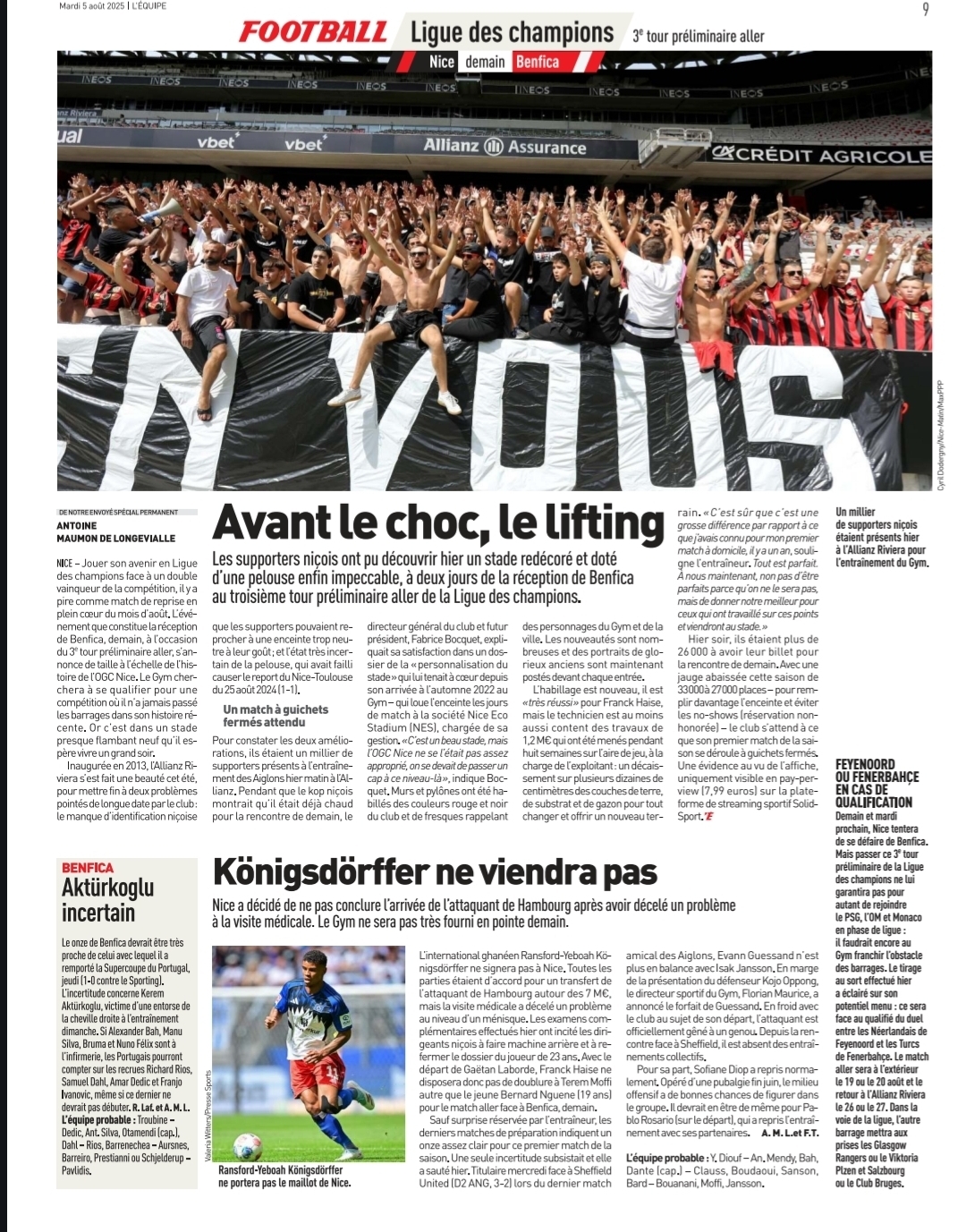 Guessand se ressent d'une petite blessure au genou depuis le dernier match amical. Même si l'on pense à une blessure diplomatique, il rejoint Youssouf, Bombito, Abelmonen, N'Dombélé dans les rangs de l'infirmerie.