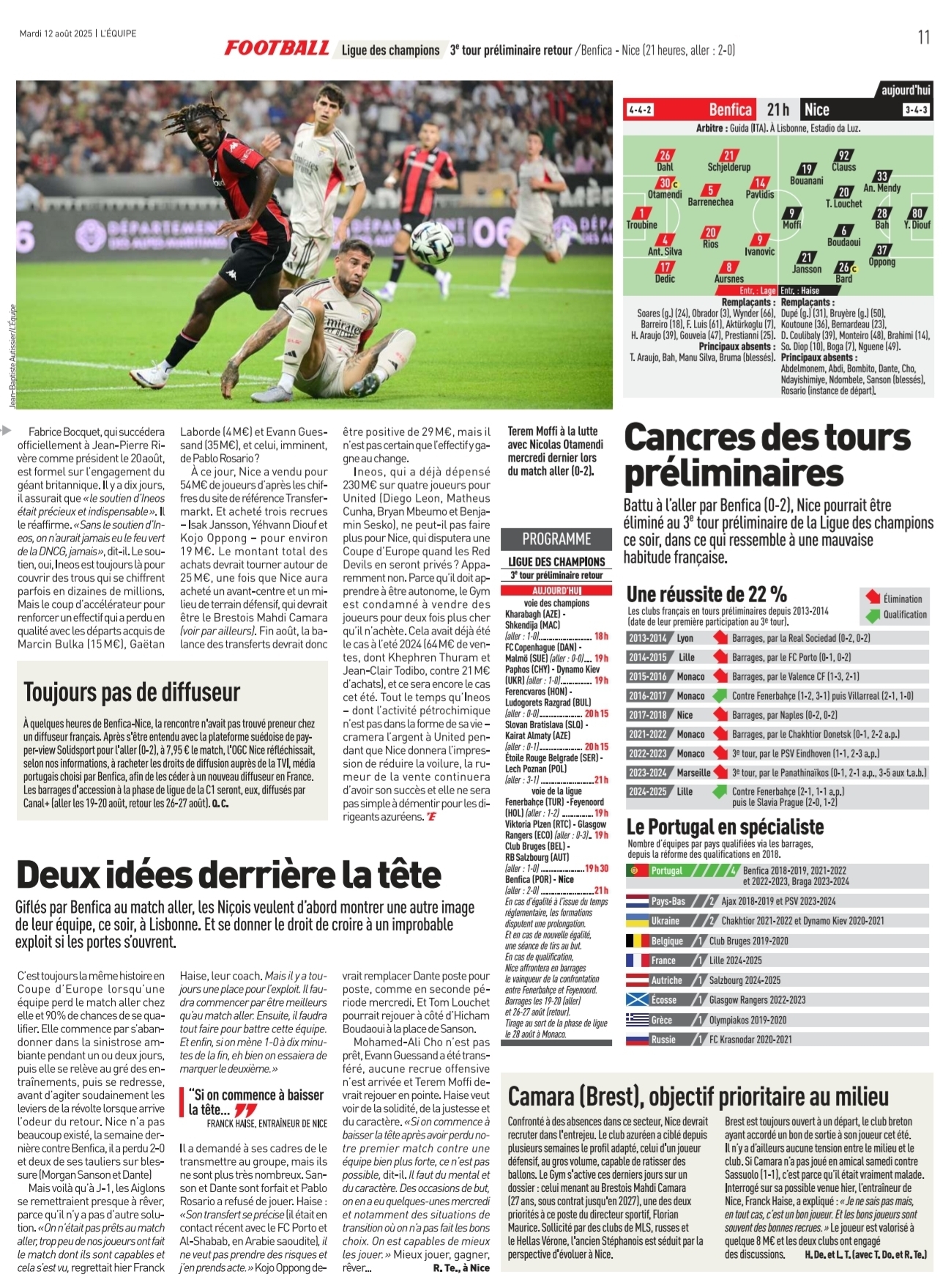 Ils seront absents tous les deux. Pour Morgan, on n'a pas de date de reprise, il faudra voir plus tard dans le mois mais on n'est pas sur un retour à court terme. Dante, ce sont ses genoux (le droit, qui avait subi une opération du ménisque la saison passée, a été touché contre Benfica ; le gauche avait subi une rupture du ligament croisé en 2020). Après, on peut espérer le retour de Dante contre Toulouse mais ce n'est pas sûr. Cho n'a pas repris l'entraînement collectif, il a juste fait des échauffements avec nous. Il est l'un des seuls joueurs absents pour Benfica qui pourrait potentiellement être disponible pour affronter Toulouse samedi.