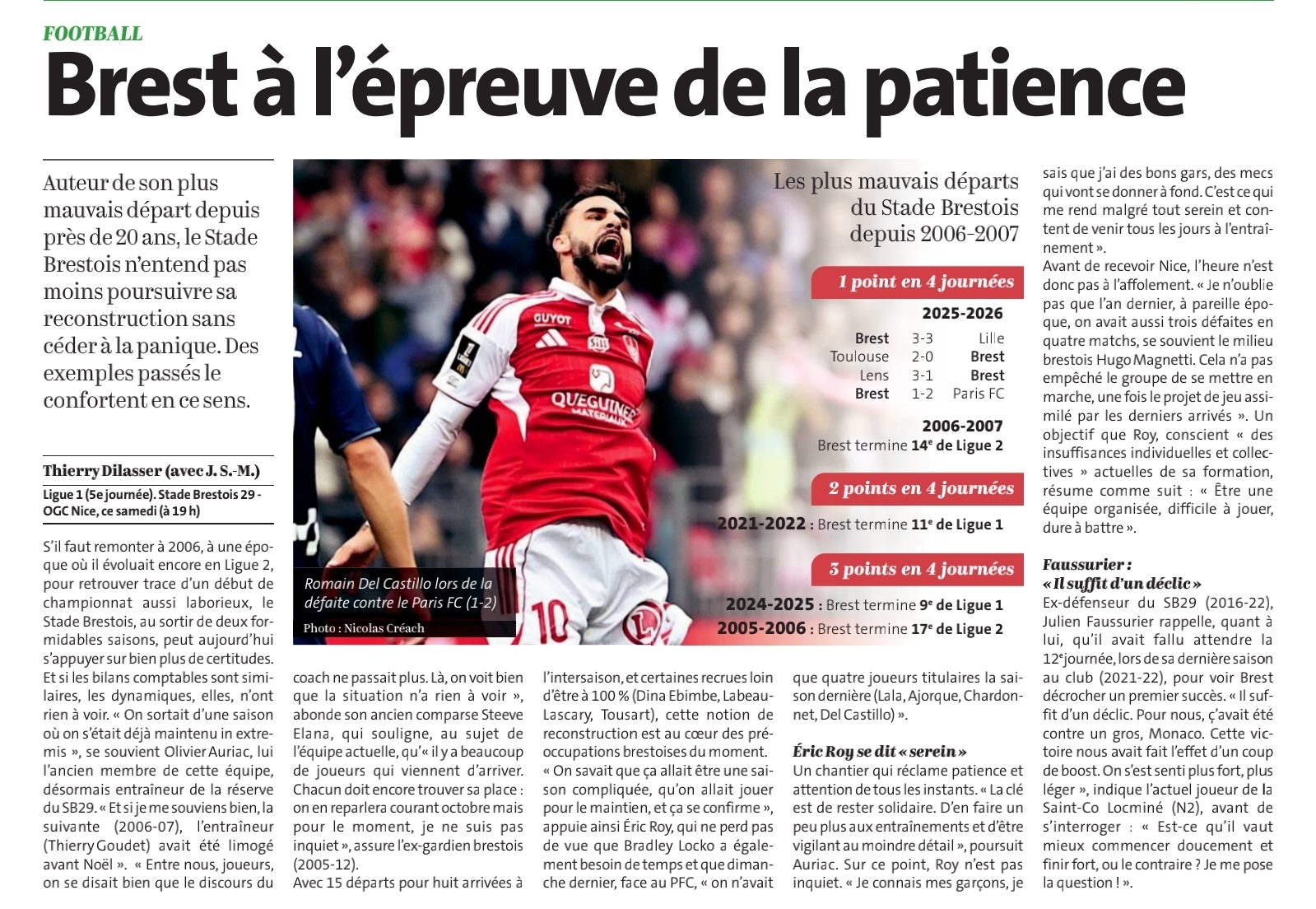 ors que le Stade Brestois sera toujours privé de Radoslaw Majecki (suspendu), mais aussi de Lucas Tousart et de Mama Baldé (blessés), Junior Dina Ebimbe a lui des chances de débuter contre Nice, ce samedi, pour le compte de la 5e journée de Ligue 1. À ses côtés, au milieu, Hugo Magnetti sera de retour de suspension.