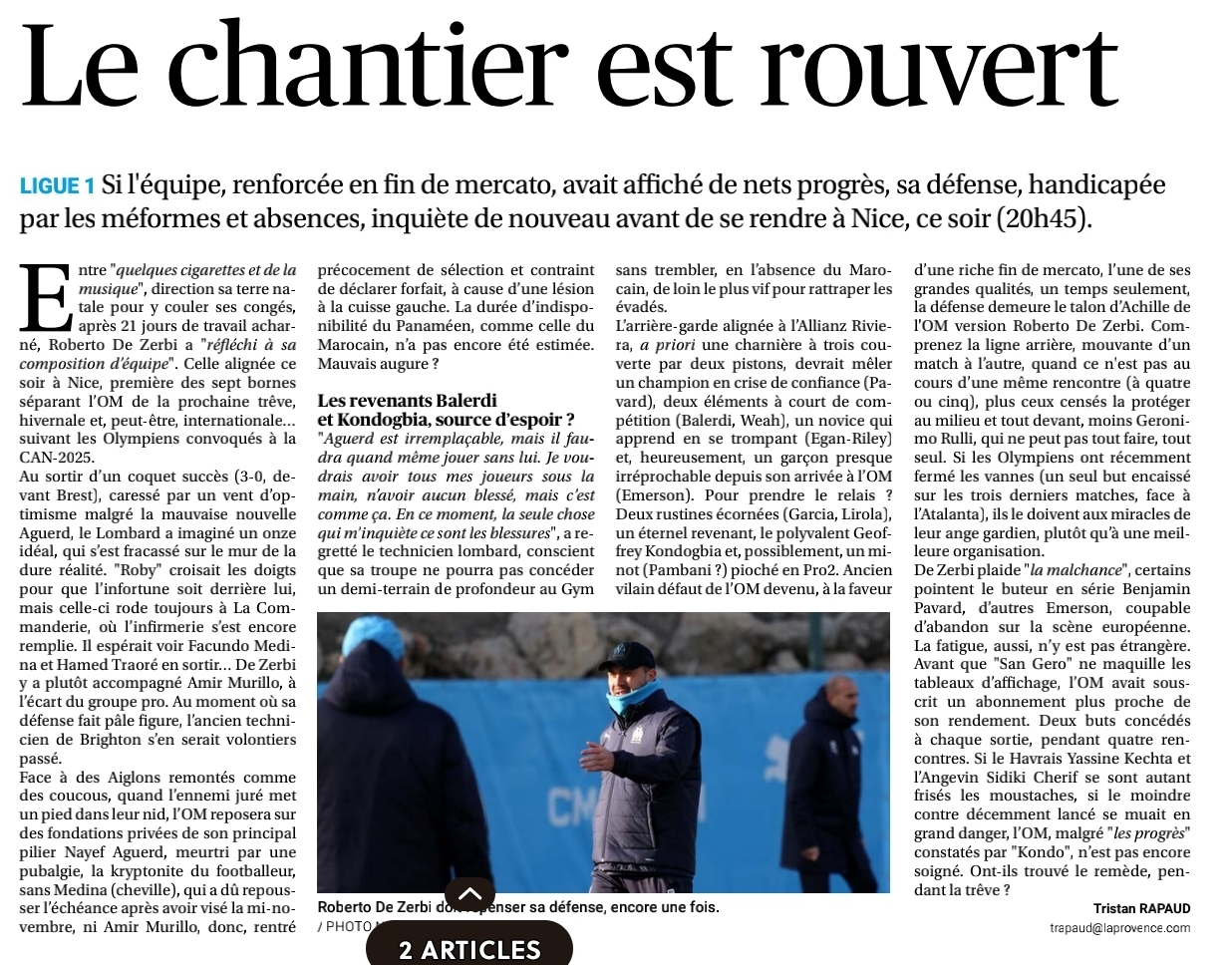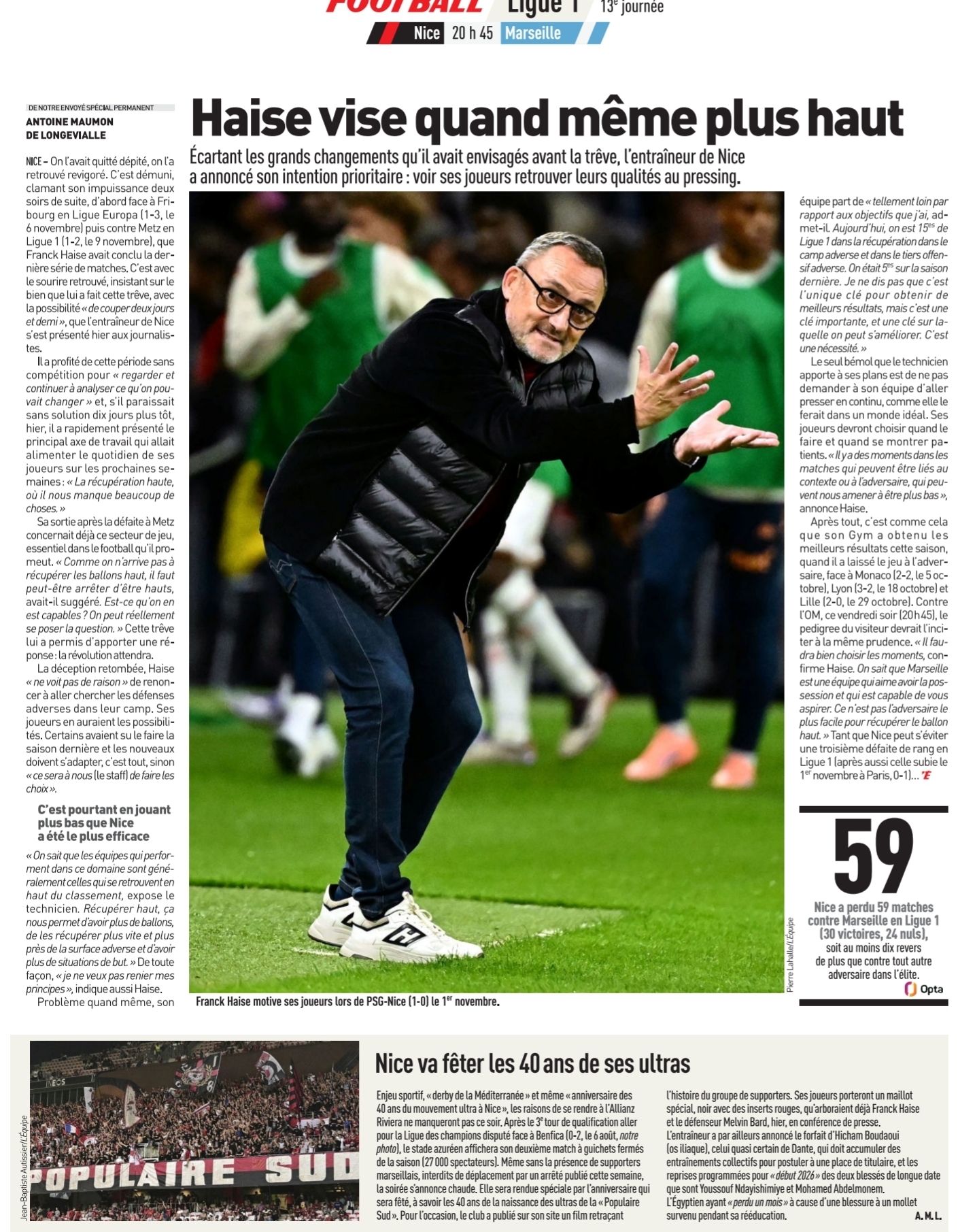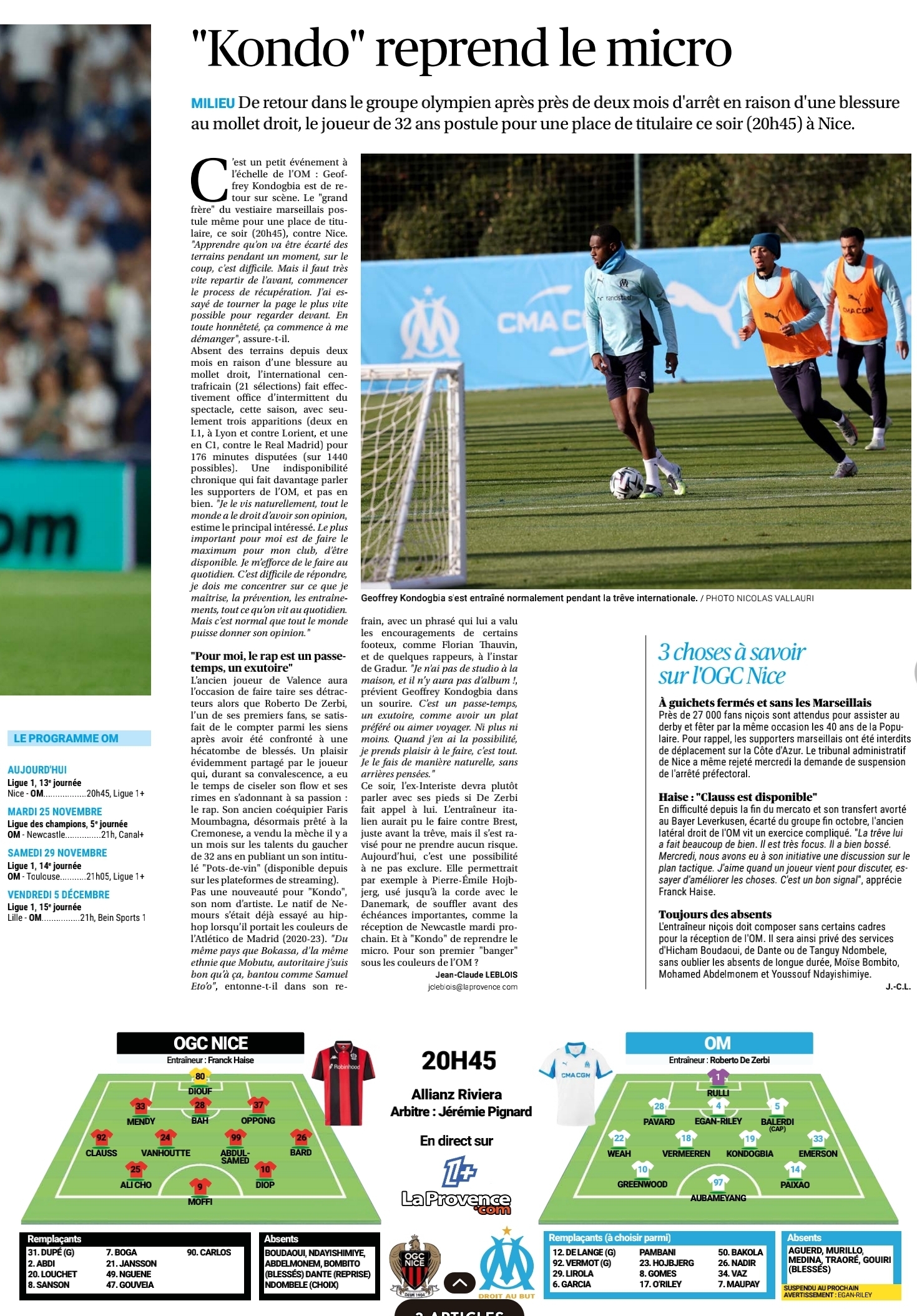 Par rapport au brassard, j'ai toujours dit au coach que ce n'était pas un poids, pas une pression. Personnellement, ça me pousse à être encore meilleur. Sur un derby comme ça, il faut rendre fier le peuple niçois, il faut aller à la guerre. On a pu se ressourcer oui pendant cette trêve. Le coach a ses idées et on essaye de le suivre. On va moins chercher haut oui par rapport à l'année dernière. On presse moins bien, à contre-temps. On a beaucoup de nouveaux joueurs, ça prend du temps.