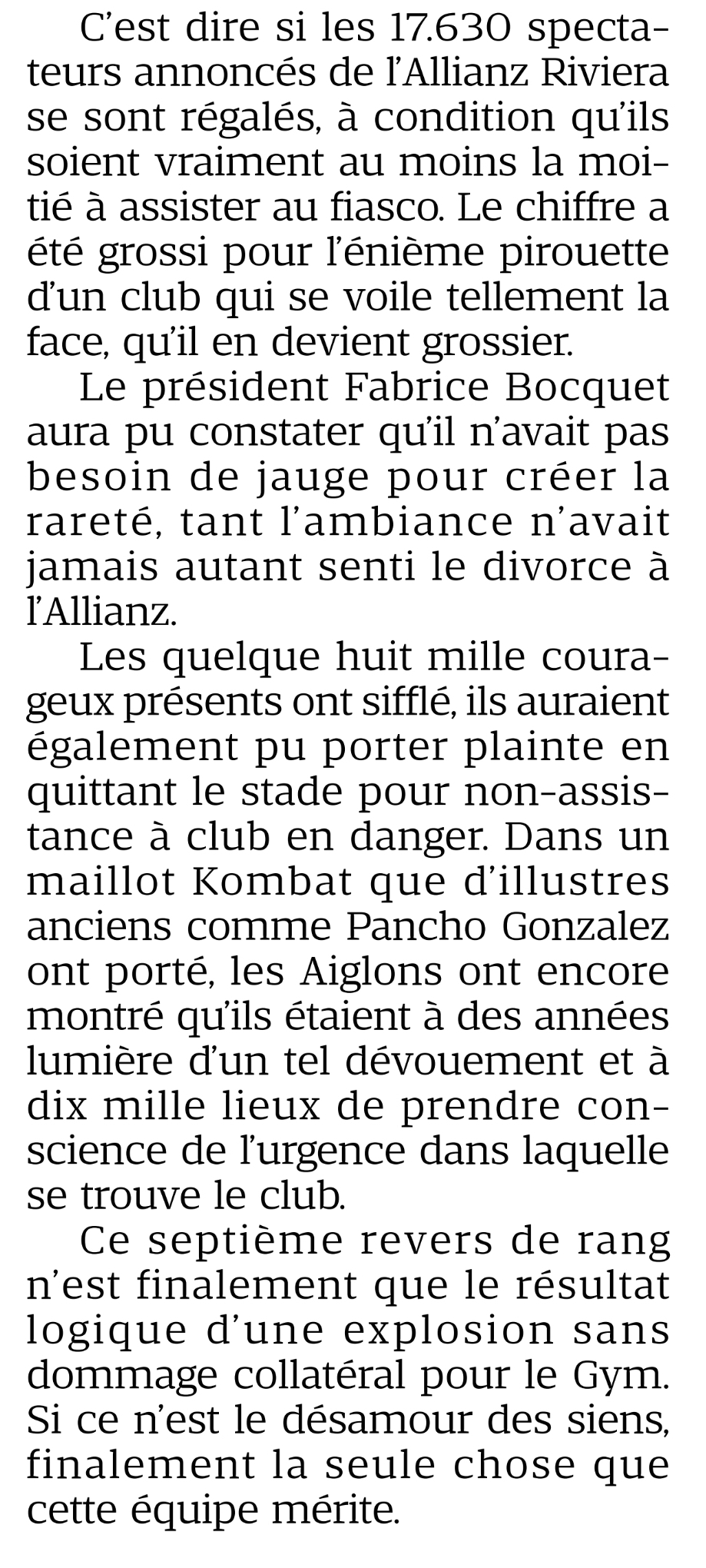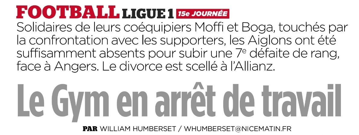 7ème défaite pour les joueurs Niçois dont les maillots étaient floqués aux noms de Moffi et Boga, joueurs qui se foutent royalement du club. Au niveau foot, la défense est toujours limitée et donne le premier but à Angers. L'attaque est faible même si N'Dombélé a fait une entrée intéressante. Nous sommes dans une spirale négative dans laquelle il serait bien de sortir.