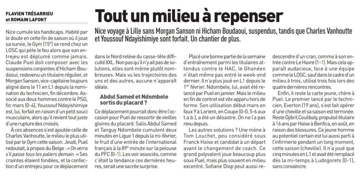 Dante ne serait toujours pas remis de son souci à un mollet. "Mohamed Abdelmonem et Youssouf Ndayishimiye non plus ne seront pas là, ils ont des petits ressentis musculaires " dixit Claude Puel... Une équipe en bois se profile et surtout nous voyons des joueurs qui ne sont pas intéressés par l'avenir du club. Les deux défenseurs sont absents depuis un an afin de soigner des ligaments croisés!!!