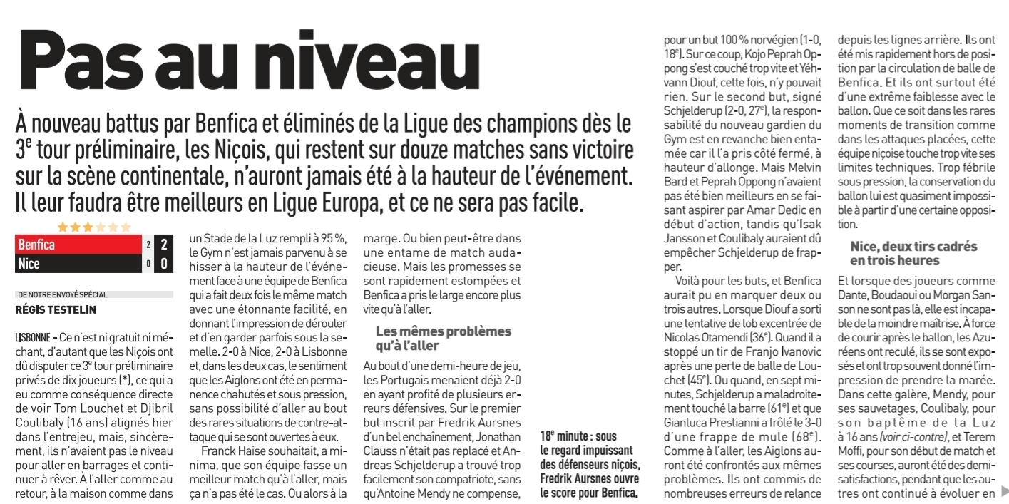 Les niçois ont été dominés lors de cette première mi-temps. Le miracle n'a pas eu lieu. En seconde période, rien à signaler. Benfica était trop fort et Nice trop faible.