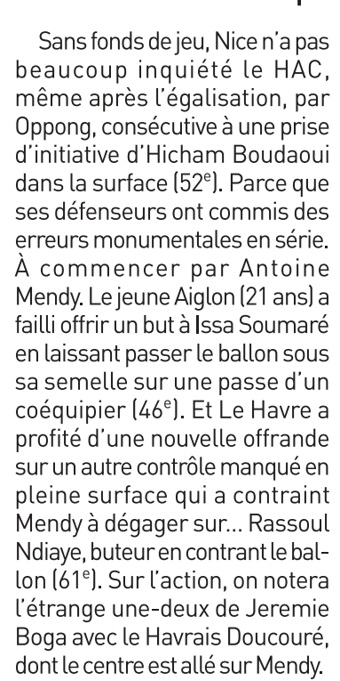 61ème Le but casquette pour les Havrais, inscrit dans la surface niçoise par Ndiaye, auteur d'un... contre sur un dégagement de Mendy. Diouf est impuissant et ne peut rien, à bout portant. Les locaux repassent devant.