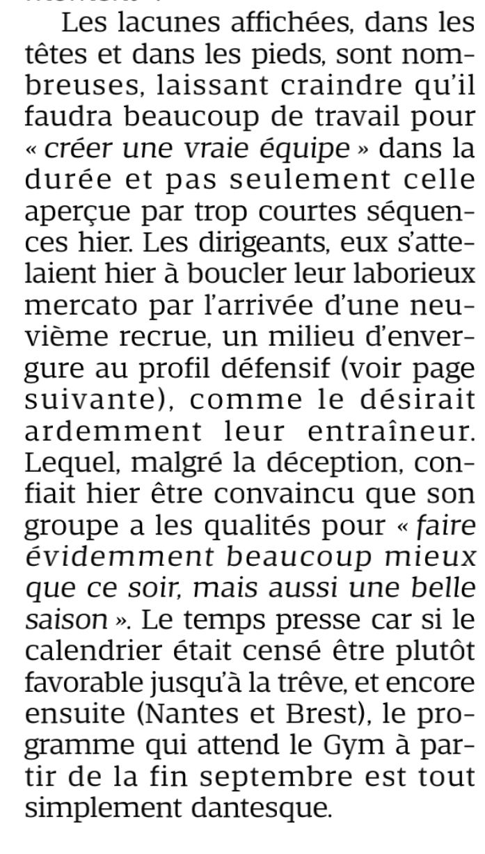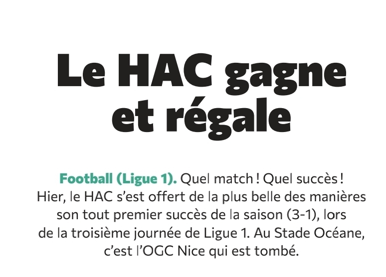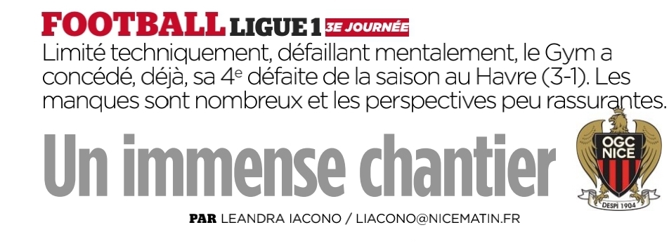 Le Havre débloque son compteur ! Face à un club qui ne lui réussit pas ces derniers temps - 3 défaites consécutives en Ligue 1 - le HAC a affiché un état d'esprit conquérant et solidaire pour l'emporter (3-1) face à une très pâle formation niçoise, très inquiétante à l'occasion de ce premier déplacement de la saison. Les suiveurs des Aiglons pourront éventuellement se réfugier derrière le fait que le Gym n'a plus remporté son premier match hors de ses bases depuis la saison 2021-2022...