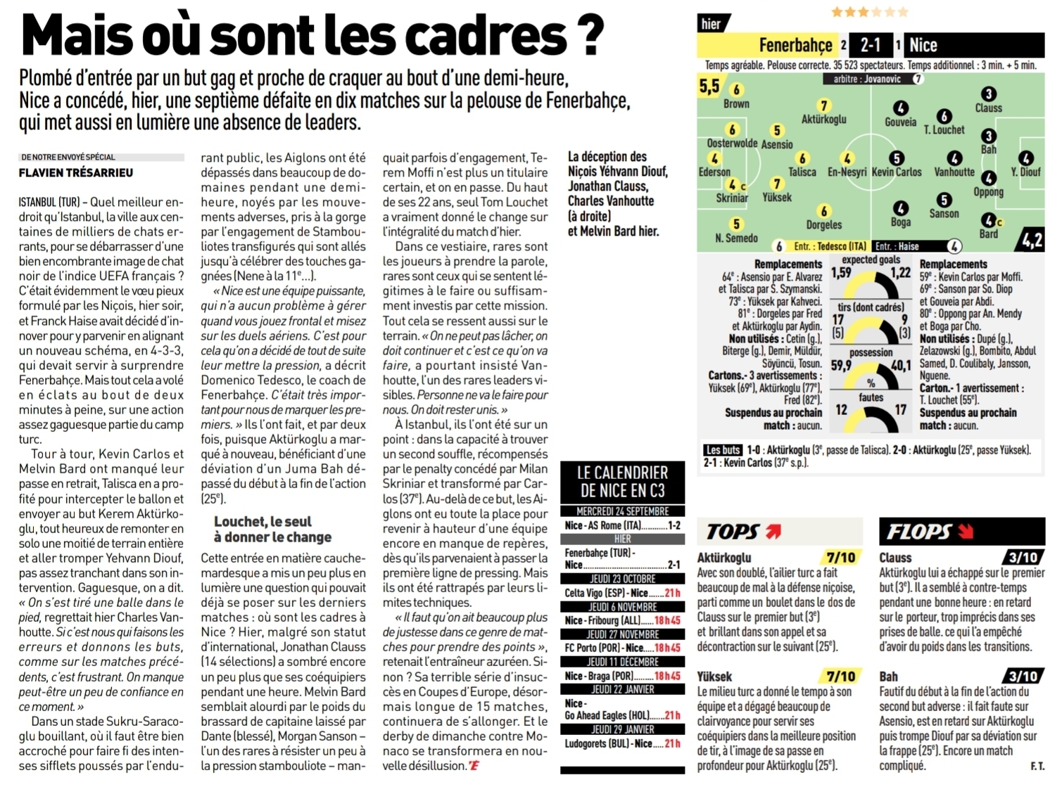 Nice n’y arrive pas. Déjà défait par l’AS Rome lors de la première journée, les Aiglons ont encaissé très rapidement un but (3e) face au Fenerbahçe dans ce match de la 2e journée de Ligue Europa. En grande délicatesse dès que les Turcs entraient dans sa moitié de terrain, les Niçois ont même encaissé un deuxième but à la 25e minute de jeu. Avant de réduire l’écart sur penalty (2-1) à la 37e. La deuxième mi-temps, bien plus hachée et équilibrée, n’a pas fait évoluer le score. Nice a poussé, mais n’a pas réussi à tromper de nouveau Ederson. Deuxième défaite en deux matchs de Ligue Europa pour Nice, qui se complique la tâche dans l’optique d’une qualification. Eurosport.