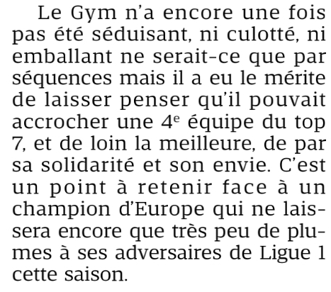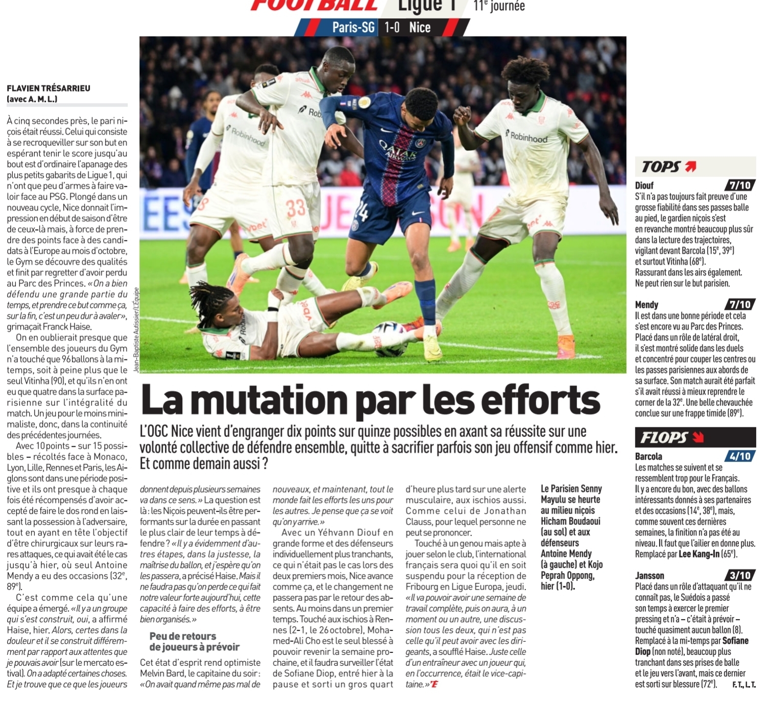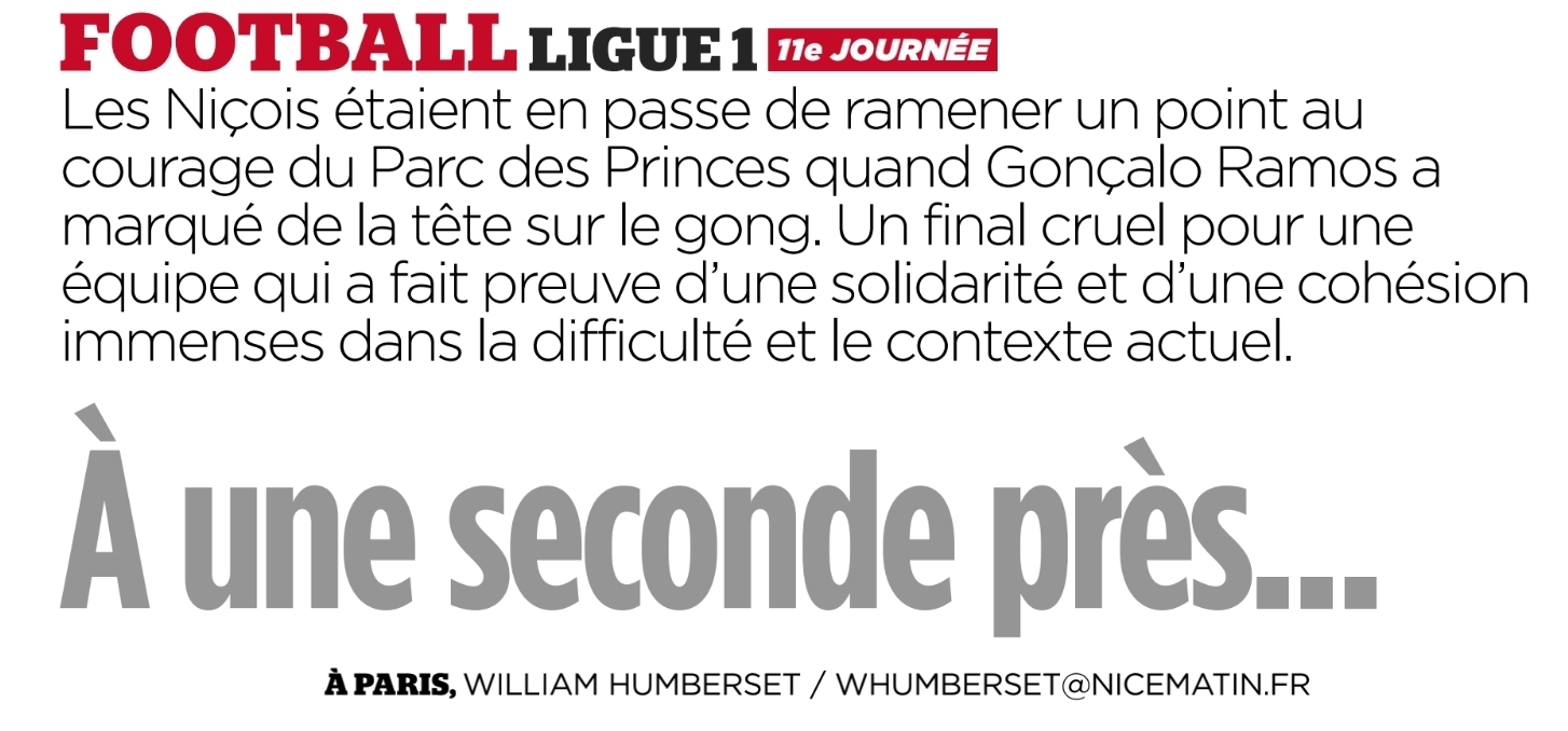 Les aiglons ont bien défendu mais n'ont pas eu beaucoup d'occasion comme les parisiens notamment en première mi-temps. Les niçois avaient réussi un match admirable de courage et d'abnégation jusqu'à la dernière minute avec un Diouf en feu... Malheureusement, le dernier corner fut fatal.
