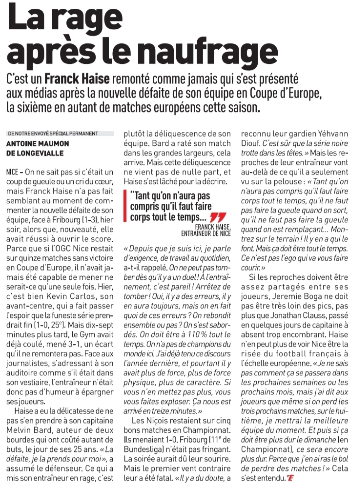 Nice, désespérant pour ses supporteurs, a perdu un quatrième match consécutif en Ligue Europa cette saison, à domicile contre Fribourg (3-1) et, à mi-parcours dans la compétition, n'a toujours pas inscrit le moindre point.