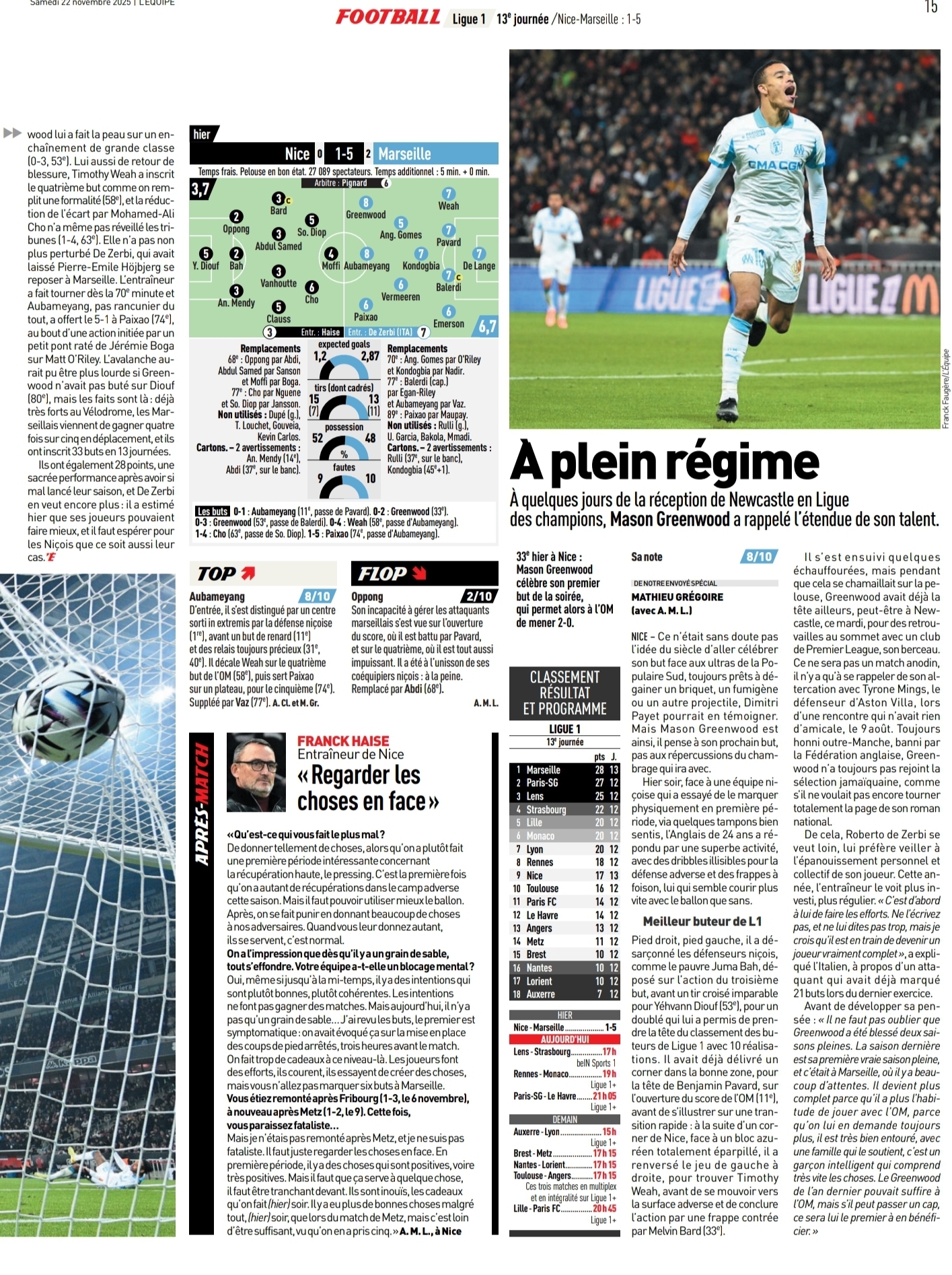 En attendant mardi, les Marseillais repartent de la Côte d'Azur installés sur la première marche du podium, dont seul le Paris Saint-Germain pourra les déloger, en cas de succès samedi soir (21 heures) face au Havre. Pour Nice en revanche, les affaires ne s'arrangent pas. 9es avant les autres matchs de cette 13e journée, les Aiglons viennent en effet d'enchaîner trois défaites consécutives en championnat et ont très souvent paru totalement impuissants vendredi. AFP