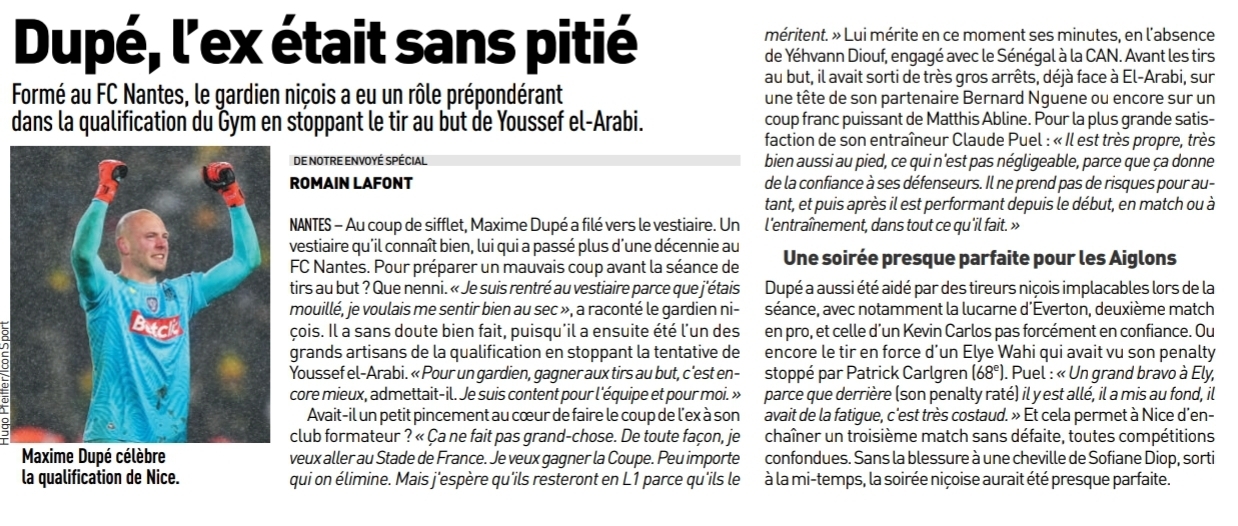 Et à ce petit jeu, ce sont les Aiglons qui l’ont emporté grâce à un ancien nantais. Gardien des Niçois en Coupe de France, Maxime Dupé a sorti la tentative de Youssef El-Arabi et ainsi qualifié son équipe pour le prochain tour. Dur pour les Canaris qui doivent rester soudés pour lutter en vue du maintien en Ligue 1. Ouest France.
