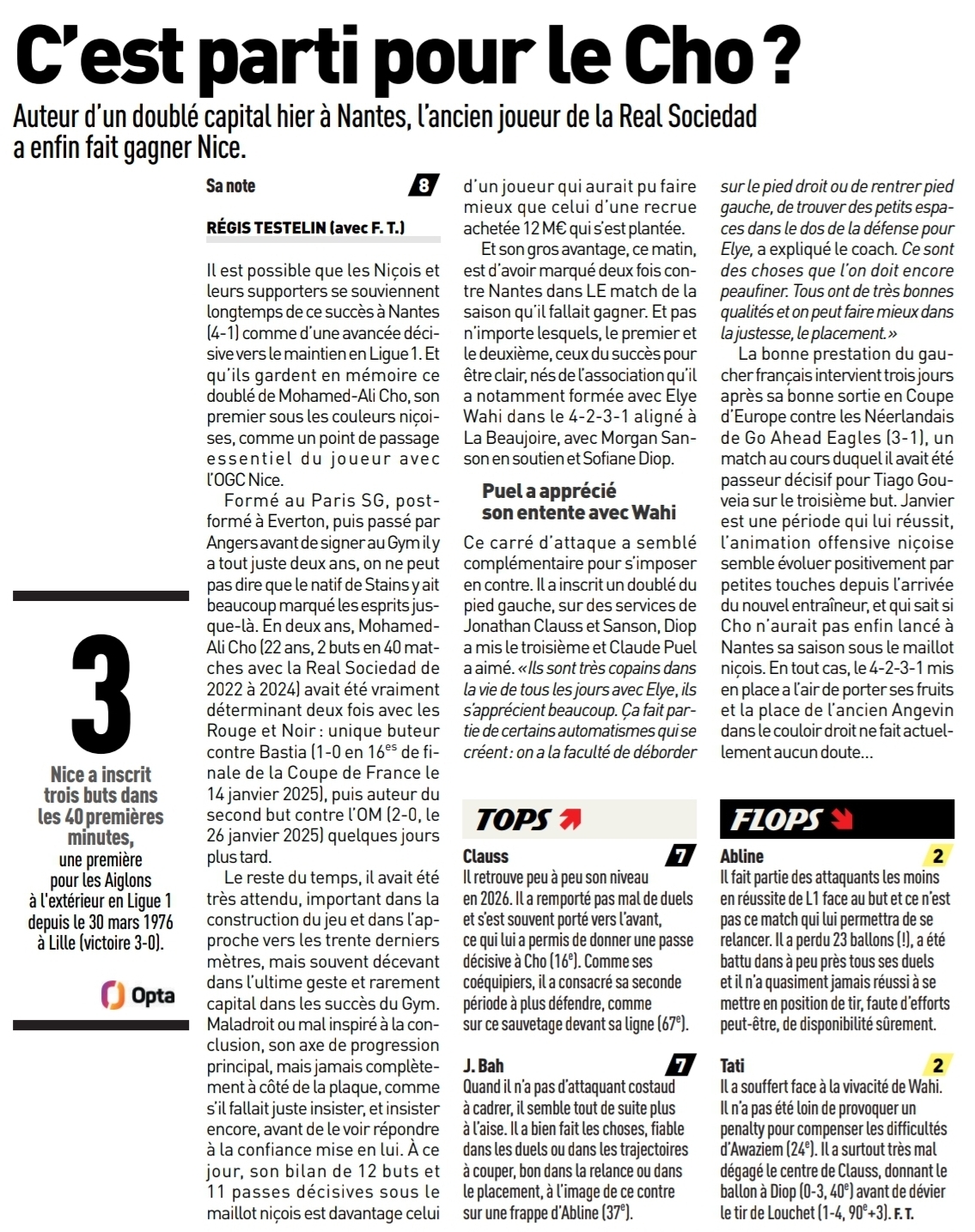 Nice a frappé fort à la Beaujoire. En grande difficulté ces dernières semaines, l'OGC Nice a surclassé le FC Nantes (1-4), ce dimanche lors de la 19e journée de Ligue 1. Portés par un Mohamed Ali Cho étincelant, auteur d'un doublé, les Aiglons ont puni chaque approximation nantaise et se donnent de l'air au classement, tandis que les Canaris s'enfoncent un peu plus aux portes de la zone rouge.